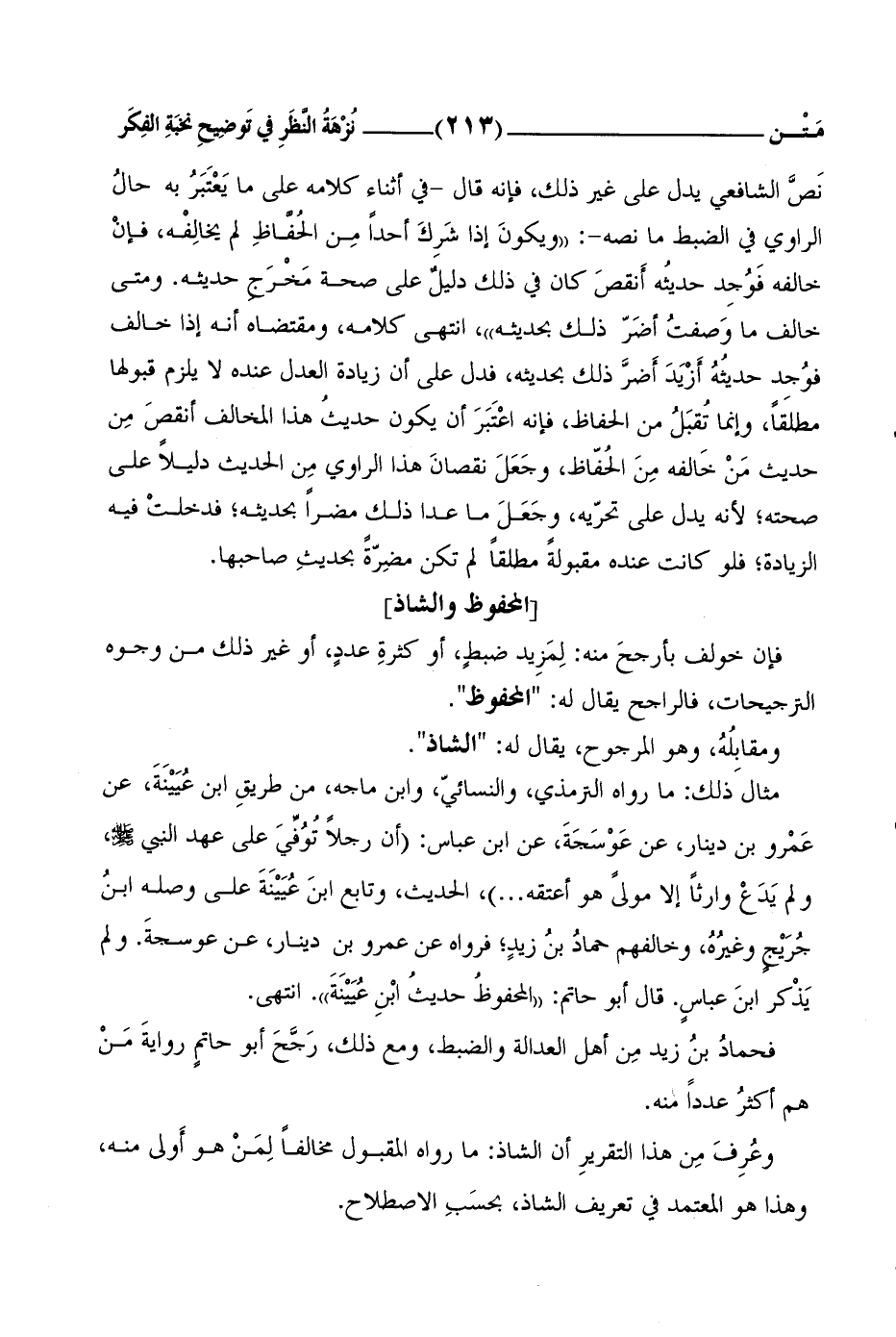 نَصَّ الشافعي يدل على غير ذلك، فإنه قال -في أثناء كلامه على ما يَعْتَبَرُ بهِ حالُ الرَّاوي في الضبط ما نصه-: ويكونَ إذا شَرِكَ أَحداً مِن الحُفَّاظِ لم يخالِفْه، فإنْ خالَفَهُ فَوُجِد حديثُه أَنقصَ كانَ في ذلك دليلٌ على صحَّةِ مَخْرَجِ حديثِهِ. ومتى خالَفَ ما وَصفتُ أضَرّ ذلك بحديثه، انتهى كلامه، ومُقتَضاهُ أَنَّهُ إِذا خَالَفَ فوُجِد حديثُهُ أَزْيَدَ أَضرَّ ذلك بحديثِه، فدلَّ على أَنَّ زيادةَ العَدْلِ عندَه لا يلزَمُ قَبولُها مُطْلقاً، وإِنَّما تُقبَلُ من الحفاظ، فإِنَّهُ اعْتَبَرَ أَنْ يكونَ حديثُ هذا المُخالِفِ أنقصَ مِن حديثِ مَنْ خَالفه مِنَ الحُفّاظ، وجَعَلَ نقصانَ هذا الرَّاوي مِن الحديثِ دليلاً على صحته؛ لأنه يَدُلُّ على تَحَرِّيهِ، وجَعَلَ ما عَدا ذلك مُضِرّاً بحديثِه؛ فدخلتْ فيهِ الزِّيادةُ؛ فلو كانتْ عندَه مقبولةً مُطْلقاً لم تكنْ مضِرّةً بحديثِ صاحبها.