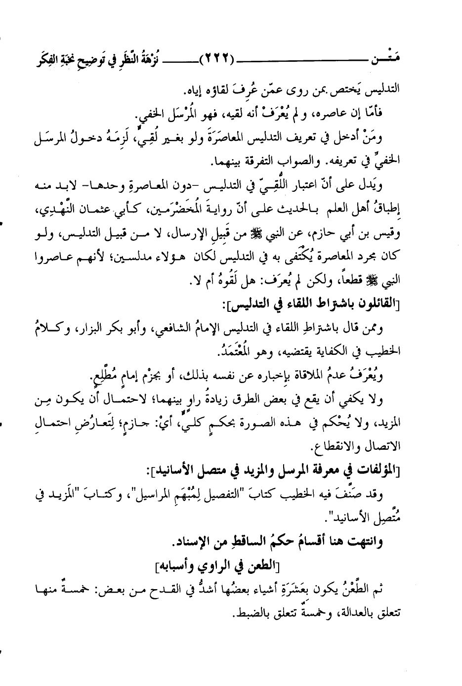 وممَّن قالَ باشتراطِ اللِّقاءِ في التَّدليسِ الإمامُ الشافعيُّ، وأَبو بكرٍ البزَّارُ، وكلامُ الخطيبِ في الكِفايةِ يقتَضيهِ، وهُو المُعْتَمَدُ.
