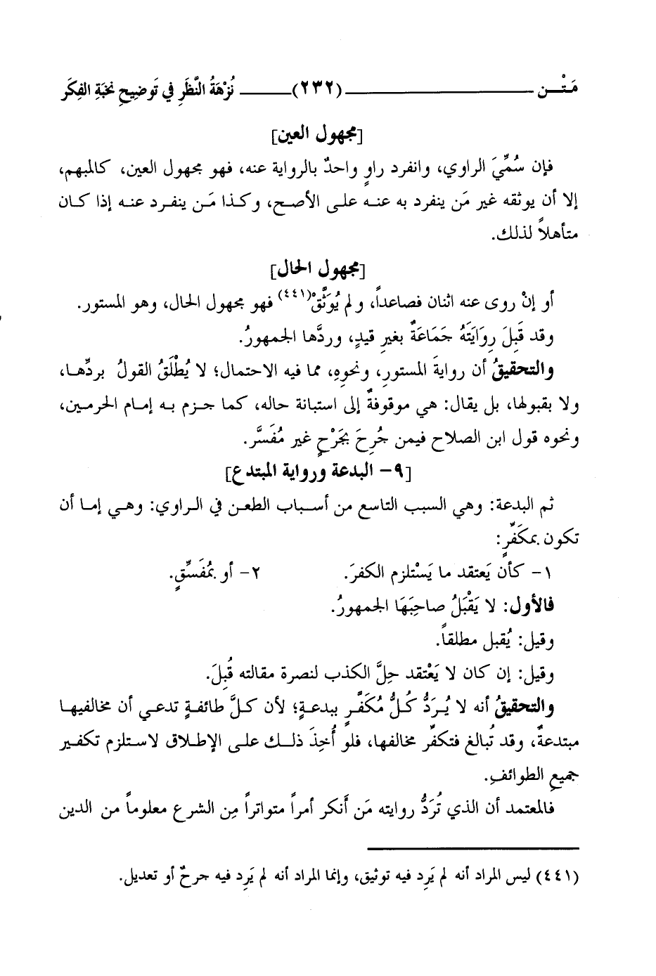 ثمَّ البِدْعَةُ: وهي السَّببُ التَّاسعُ مِن أَسبابِ الطَّعنِ في الرَّاوي: وهي إِمَّا أَنْ تَكونَ بمكَفِّرٍ: