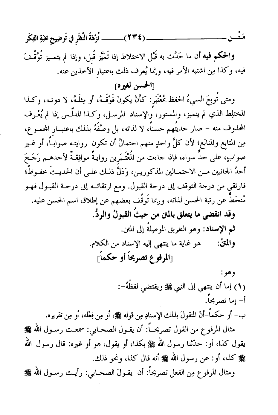 ب- أَوْ حُكْماً-أَنَّ المنقولَ بذلك الإسنادِ مِن قوله صلى الله عليه وسلَّمَ، أَوْ مِن فِعْله، أو مِن تَقريرِهِ.