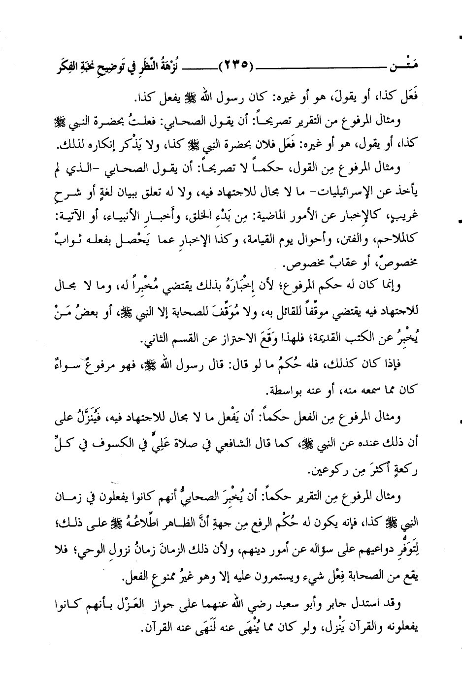 ومِثالُ المَرفوعِ مِن الفِعْلِ حُكماً: أَنْ يَفْعل ما لا مَجالَ للاجْتِهادِ فيهِ، فَيُنَزَّلُ على أَنَّ ذلك عندَه عنِ النبيِّ صلَّى اللهُ عليه وسلم، كما قال الشافعي في صلاة عَلِيٍّ في الكُسوفِ في كلِّ ركعةٍ أكثرَ مِن رُكوعَيْنِ.