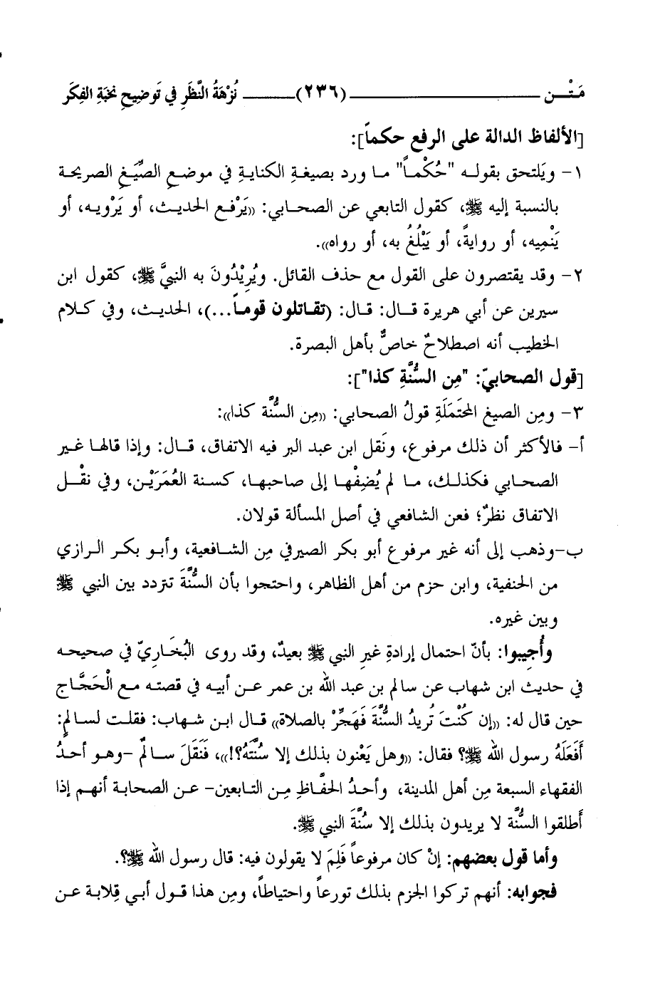 وأُجِيبوا: بأَنَّ احْتِمالَ إرادةِ غيرِ النبي صلى الله عليه وسلم بعيدٌ، وقد روى البُخَارِيّ في صحيحِه في حديثِ ابنِ شِهابٍ عن سالِمِ بنِ عبدِ اللهِ بنِ عُمَرَ عن أَبيهِ في قصَّتِه معَ الْحَجَّاج حينَ قالَ لهُ: إِنْ كُنْتَ تُريدُ السُّنَّةَ فَهَجِّرْ بالصلاة قالَ ابنُ شِهابٍ: فقلتُ لسالمٍ: أَفَعَلَهُ رسولُ الله صلى الله عليه وسلَّمَ؟ فقالَ: وهل يَعْنون بذلك إِلاَّ سُنَّتَهُ؟!، فَنَقَلَ سالمٌ -وهو أحدُ الفُقهاءِ السَّبعَةِ مِن أهل المدينة، وأحدُ الحفَّاظِ مِن التَّابعينَ- عنِ الصَّحابةِ أَنَّهم إِذا أَطلقوا السُّنَّة لا يُريدونَ بذلك إِلاَّ سُنَّةَ النبيِّ صلى الله عليه وسلم.
