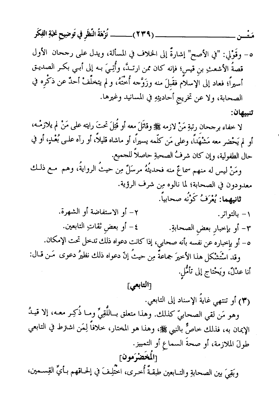 وهو مَن لَقِيَ الصَّحابِيَّ كذلكَ. وهذا متعلِّقٌ باللُّقِيِّ وما ذُكِر معهُ، إِلاَّ قيدُ الإِيمانِ بهِ، فذلك خاصٌّ بالنبي صلى الله عليه وسلم، وهذا هُو المُختارُ، خلافاً لِمَن اشْتَرَطَ في التَّابعيِّ طولَ الملازمة، أو صحةَ السماعِ أو التمييز.