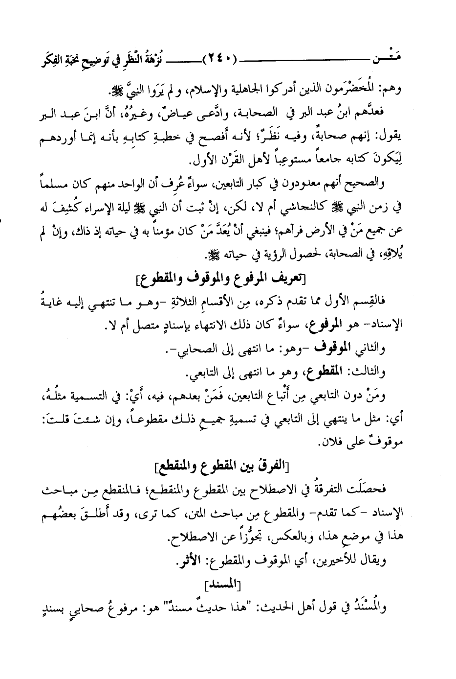 فالقِسم الأوَّلُ ممَّا تقدَّمَ ذِكْرُهُ، مِن الأقسامِ الثلاثةِ -وهو ما تنتهي إليه غايةُ الإِسنادِ- هُو المَرْفوعُ، سواءٌ كانَ ذلك الانتهاء بإسنادٍ متصل أم لا.