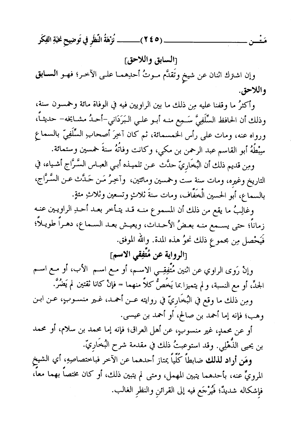 ومَن أراد لذلك ضابطاً كُلِّياً يمتاز أَحدُهما عنِ الآخَرِ فباختصاصِهِ، أَي الشيخِ المرويِّ عنه، بأَحَدِهِما يَتَبَيَّنُ المُهْمَلُ، ومتى لم يتَبَيَّنْ ذلك، أَو كانَ مختَصّاً بهما معاً، فإِشكاله شديدٌ؛ فَيُرْجَع فيه إلى القرائنِ والنظرِ الغالب.