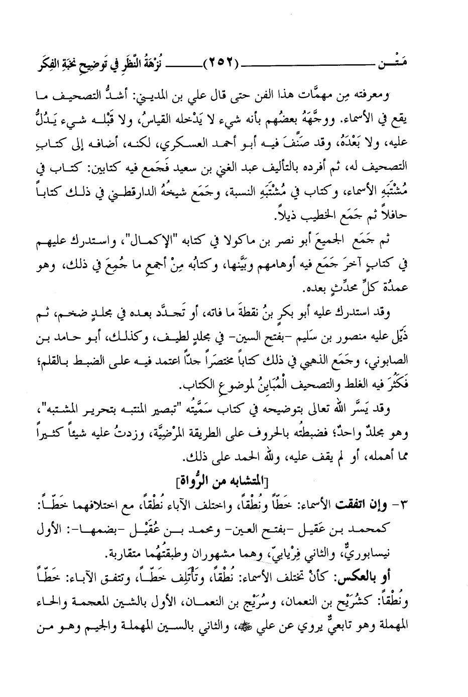ومعرِفَتُه مِن مهمَّات هذا الفنِّ حتَّى قالَ عليُّ بنُ المَدينيِّ: أشدُّ التَّصحيفِ ما يقعُ في الأسماءِ. ووجَّهَهُ بعضُهم بأنه شيء لا يَدْخله القياسُ، ولا قَبْله شيءٌ يَدُلُّ عليهِ، ولا بَعْدَهُ، وقد صَنَّفَ فيهِ أَبو أَحمدَ العسكريُّ، لكنَّه، أضافه إلى كتابِ التَّصحيفِ له، ثمَّ أَفرَدَهُ بالتَّأْليفِ عبدُ الغنيِّ بن سعيد فَجَمع فيه كتابين: كتاب في مُشْتَبَهِ الأسماء، وكتاب في مُشْتَبَهِ النِّسبةِ، وجَمَع شيخُهُ الدَّارقطنيُّ في ذلك كتاباً حافلاً ثم جَمَع الخَطيبُ ذَيلاً.