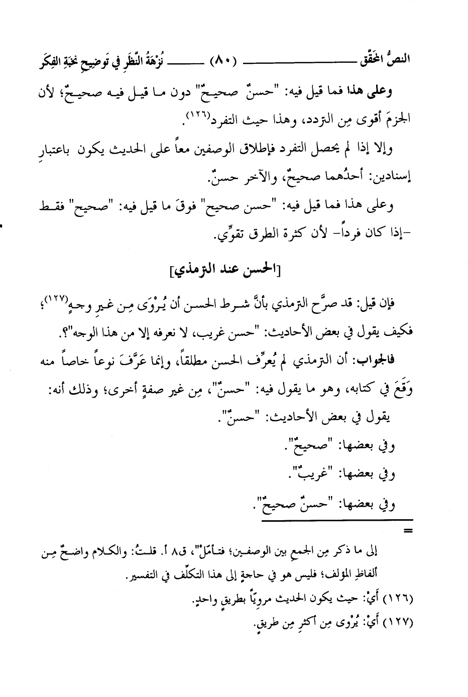 وعلى هذا فما قيلَ فيهِ: "حسنٌ صحيحٌ" دونَ ما قيلَ فيهِ صحيحٌ؛ لأنَّ الجزمَ أقوى مِن التردد، وهذا حيث التفرد1.