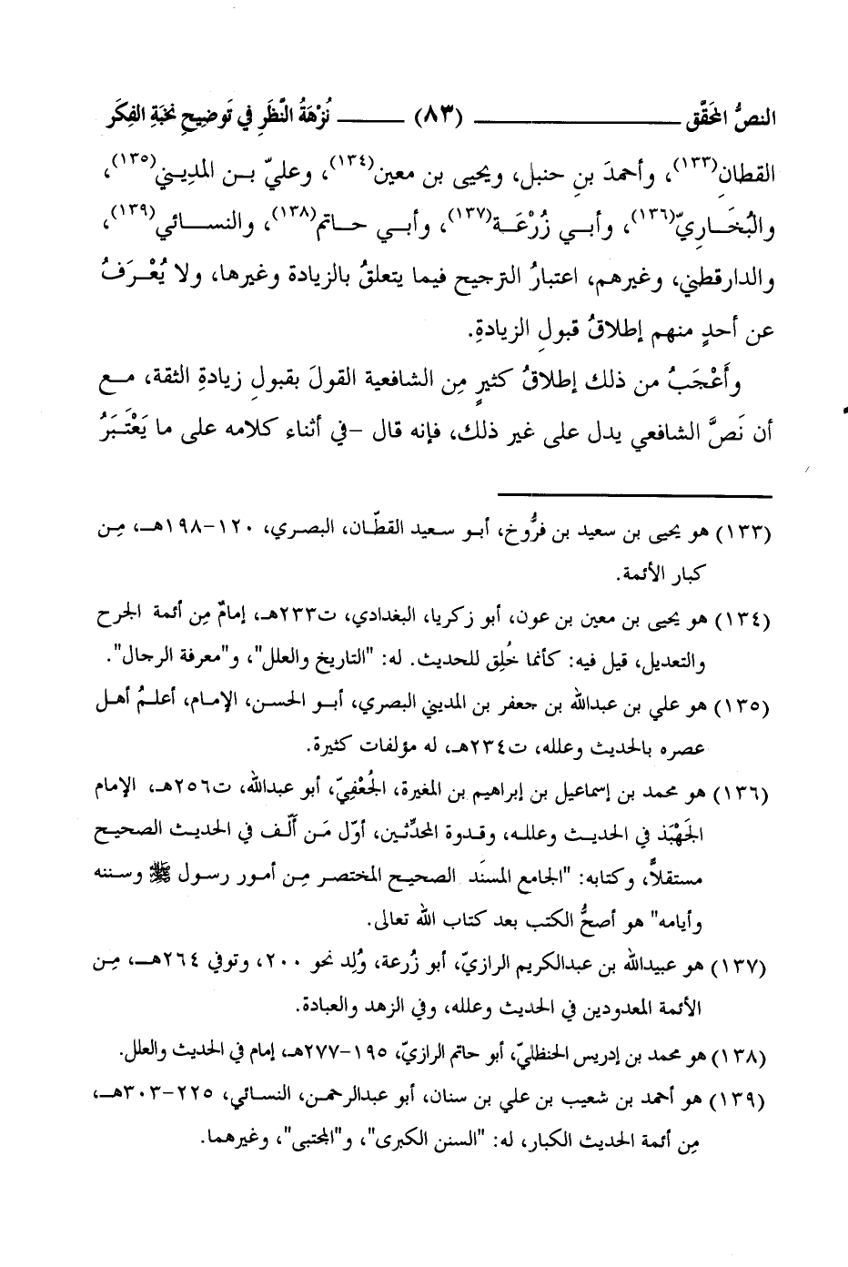 القطانِ1، وأحمدَ بنِ حنبلٍ، ويحيى بنِ مَعينٍ2، وعليّ بن المدِيني3، والبُخَارِيّ4، وأبي زُرْعَة5، وأَبي حاتمٍ6، والنَّسائيِّ7، والدَّارقطنيِّ، وغيرِهم، اعتبارُ التَّرجيحِ فيما يتعلقُ بالزِّيادةِ وغيرها، ولا يُعْرَفُ عن أحدٍ منهُم إطلاقُ قبولِ الزيادةِ.