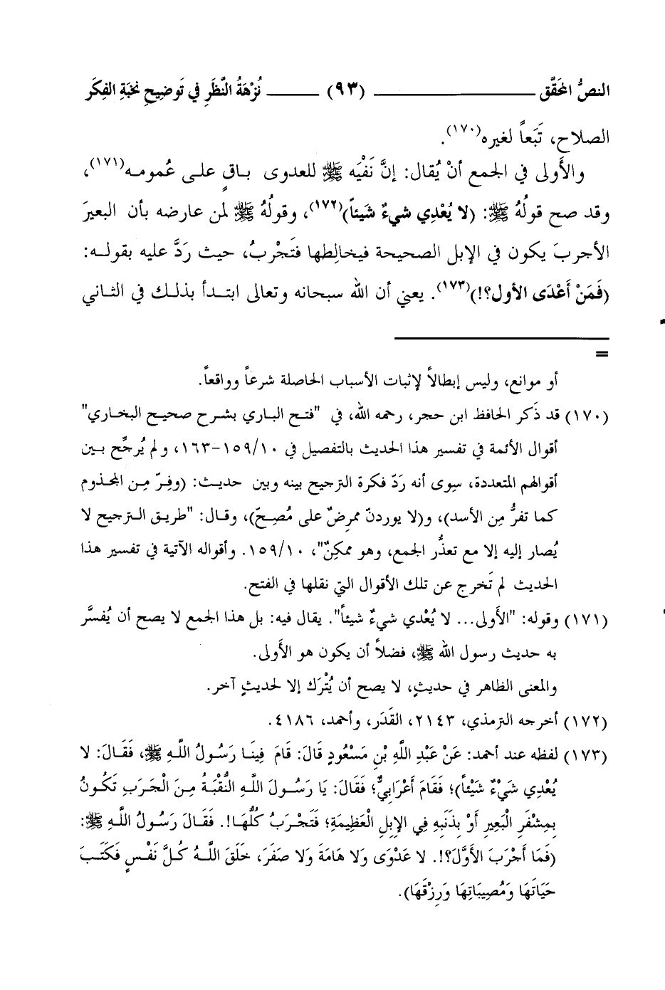 2 وقوله: والأَولى " ... لا يُعْدي شيءٌ شيئاً". يقال فيه: بل هذا الجمع لا يصح أن يُفسَّر به حديث رسول الله صلى الله عليه وسلم، فضلاً أن يكون هو الأَولى.