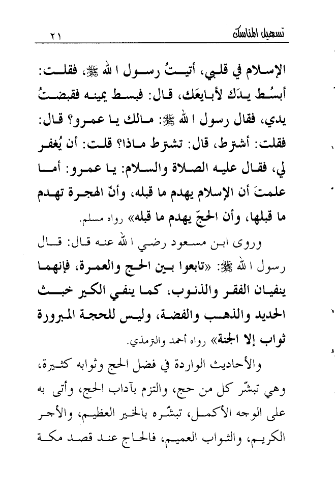 وروى ابن مسعود رضي الله عنه قال: قال رسول الله صلى الله عليه وسلم: " تابعوا بين الحج والعمرة، فإنهما ينفيان الفقر والذنوب، كما ينفي الكير خبث الحديد والذهب والفضة، وليس للحجة المبرورة ثواب إلا الجنة " رواه أحمد والترمذي. والأحاديث الواردة في فضل الحج وثوابه كثيرة، وهي تبشّر كل من حج، والتزم بآداب الحج، وأتى به على الوجه الأكمل، تبشّره بالخير العظيم، والأجر الكريم، والثواب العميم، فالحاج عند قصد مكة