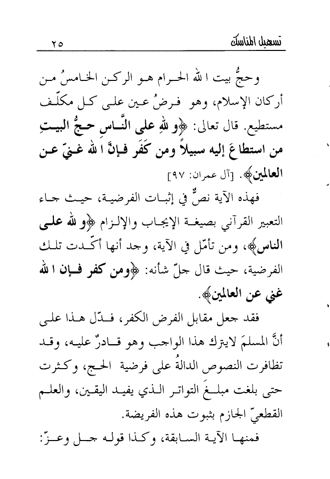 فهذه الآية نصٌّ في إثبات الفرضية، حيث جاء التعبير القرآني بصيغة الإيجاب والإلزام {وَلِلَّهِ عَلَى النَّاسِ} ، ومن تأمّل في الآية، وجد أنها أكدت تلك الفرضية، حيث قال جل شأنه: {وَمَنْ كَفَرَ فَإِنَّ اللَّهَ غَنِيٌّ عَنِ الْعَالَمِينَ} .