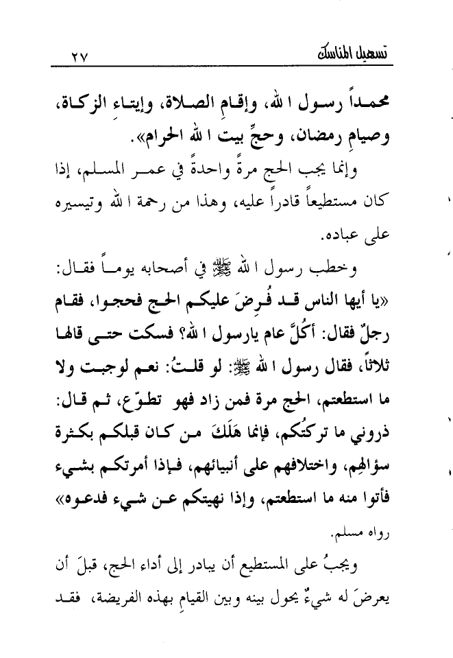 وخطب رسول الله صلى الله عليه وسلم في أصحابه يوماً فقال: "يا أيها الناس قد فُرِضَ عليكم الحج فحجوا، فقام رجل فقال: أكُلَّ عام يا رسول الله؟ فسكت حتى قالها ثلاثاً، فقال رسول الله صلى الله عليه وسلم: لو قلتُ: نعم لوجبت ولا ما استطعتم، الحج مرة فمن زاد فهو تطوّع، ثم قال: ذروني ما تركتكم، فإنما هَلَك من كان قبلكم بكثرة سؤالهِم، واختلافهم على أنبيائهم، فإذا أمرتكم بشيء فأتوا منه ما استطعتم، وإذا نهيتكم عن شيء فدعوه" رواه مسلم.