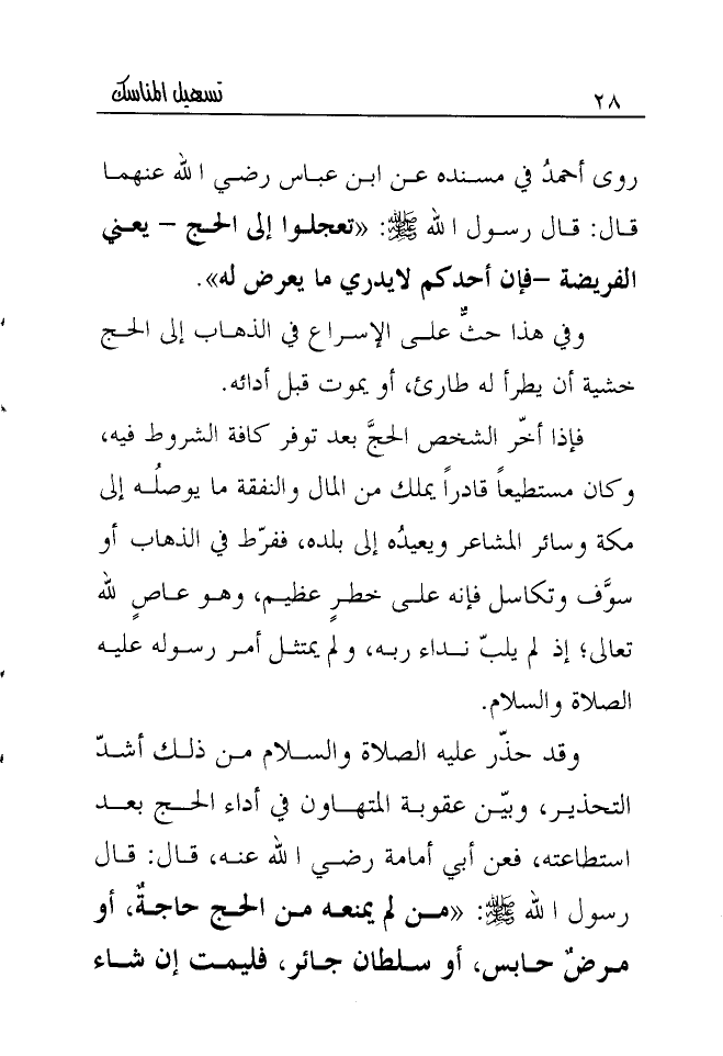 روى أحمد في مسنده عن ابن عباس رضي الله عنهما قال: قال رسول الله صلى الله عليه وسلم: "تعجلوا إلى الحج- يعني الفريضة- فإن أحدكم لا يدري ما يعرض له".