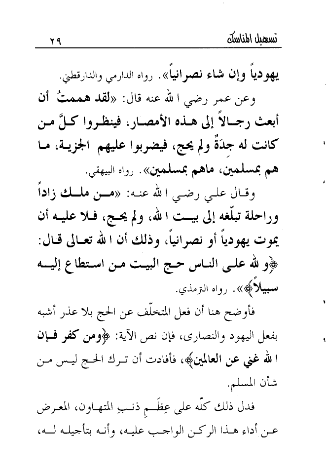 وقال علي رضي الله عنه: "من ملك زاداً وراحلة تبلّغه إلى بيت الله، ولم يحج، فلا عليه أن يموت يهودياً أو نصرانياً، وذلك أن الله تعالى قال: {وَلِلَّهِ عَلَى النَّاسِ حِجُّ الْبَيْتِ مَنِ اسْتَطَاعَ إِلَيْهِ سَبِيلاً} رواه الترمذي.