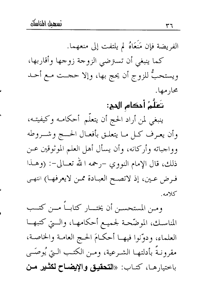 ومن المستحسن أن يختار كتاباً من كتب المناسك، الموضحة لجميع أحكامها، والتي كتبها العلماء، ودوّنوا فيها أحكام الحج العامة والخاصة، مقرونة بأدلتها الشرعية، ومن الكتب التي يُوصَى باختيارها، كتاب: "التحقيق والإيضاح لكثير من