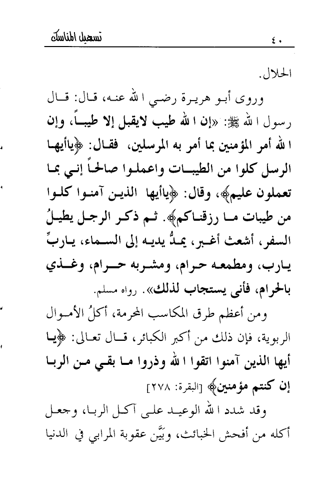 وروى أبو هريرة رضي الله عنه، قال: قال رسول الله صلى الله عليه وسلم:"إِنَّ اللَّهَ طَيِّبٌ لاَ يَقْبَلُ إِلاَّ طَيِّبًا وَإِنَّ اللَّهَ أَمَرَ الْمُؤْمِنِينَ بِمَا أَمَرَ بِهِ الْمُرْسَلِينَ فَقَالَ: {يَا أَيُّهَا الرُّسُلُ كُلُوا مِنْ الطَّيِّبَاتِ وَاعْمَلُوا صَالِحًا إِنِّي بِمَا تَعْمَلُونَ عَلِيمٌ} ، وَقَالَ: {يَا أَيُّهَا الَّذِينَ آمَنُوا كُلُوا مِنْ طَيِّبَاتِ مَا رَزَقْنَاكُمْ} . ثُمَّ ذَكَرَ الرَّجُلَ يُطِيلُ السَّفَرَ أَشْعَثَ أَغْبَرَ يَمُدُّ يَدَيْهِ إِلَى السَّمَاءِ يَا رَبِّ يَا رَبِّ وَمَطْعَمُهُ حَرَامٌ وَمَشْرَبُهُ حَرَامٌ وَمَلْبَسُهُ حَرَامٌ وَغُذِيَ بِالْحَرَامِ فَأَنَّى يُسْتَجَابُ لِذَلِكَ" رواه مسلم.