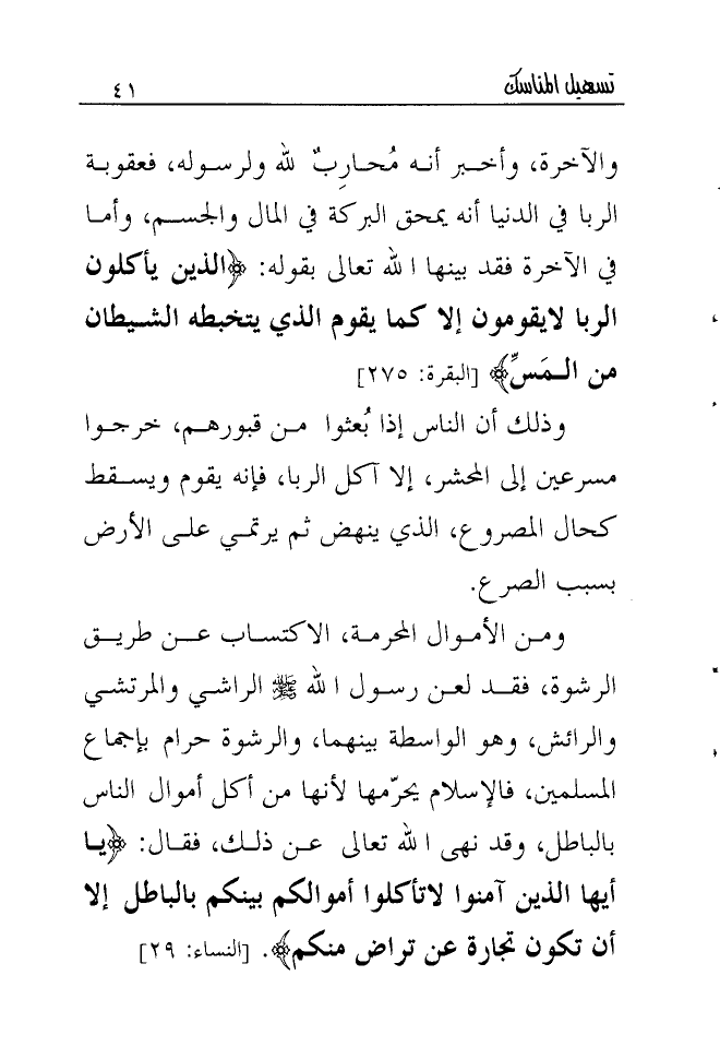 والآخرة، وأخبر أنه مُحارِبٌ لله ولرسوله، فعقوبة الربا في الدنيا أنه يمحق البركة في المال والجسم، وأما في الآخرة فقد بينها الله تعالى بقوله: {الَّذِينَ يَأْكُلُونَ الرِّبا لا يَقُومُونَ إِلَّا كَمَا يَقُومُ الَّذِي يَتَخَبَّطُهُ الشَّيْطَانُ مِنَ الْمَسِّ} [البقرة: 275] .