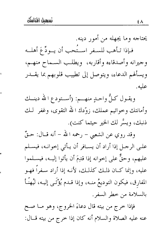 وقد روي عن الشعبي- رحمه الله- أنه قال: حقٌ على الرجل إذا أراد أن يسافر أن يأتي إخوانه، فيسلم عليهم، وحقٌّ على إخوانه إذا قدِمَ أن يأتوا إليه، فيسلموا عليه، وإنما كان ذلك كذلك، لأنه إذا أراد سفراً فهو المفارق، فيكون التوديع منه، وإذا قدم يُؤْتَى إليه، ليُهنّا بالسلامة من خطر السفر.
