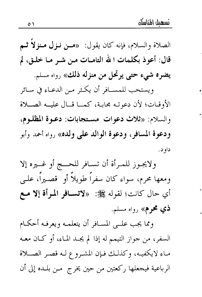 الصلاة والسلام، فإنه كان يقول: "من نزل منزلاً ثم قال: أعوذ بكلمات الله التامات من شر ما خلق، لم يضره شيء حتى يرتحل من منزله ذلك" رواه مسلم.