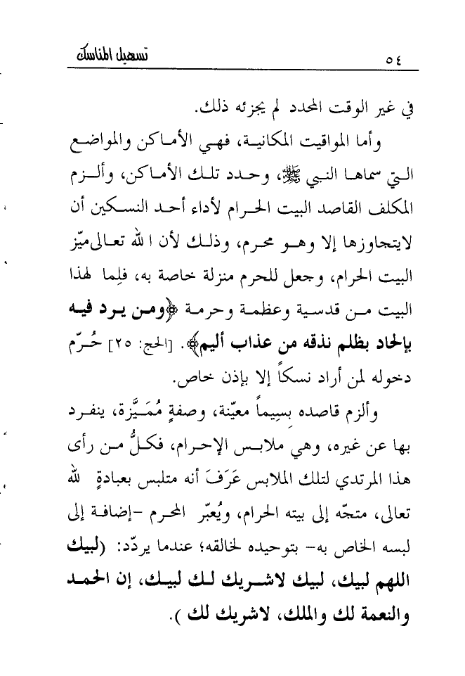 وأما المواقيت المكانية، فهي الأماكن والمواضع التي سماها النبي صلى الله عليه وسلم، وحدد تلك الأماكن، وألزم المكلف القاصد البيت الحرام لأداء أحد النسكين أن لا يتجاوزها إلا وهو محرم، وذلك لأن الله تعالى ميّز البيت الحرام، وجعل للحرم منزلة خاصة به، فيما لهذا البيت من قدسية وعظمة وحرمة {وَمَنْ يُرِدْ فِيهِ بِإِلْحَادٍ بِظُلْمٍ نُذِقْهُ مِنْ عَذَابٍ أَلِيمٍ} [الحج: 25] حُرّم دخوله لمن أراد نسكاً إلأ بإذن خاص.