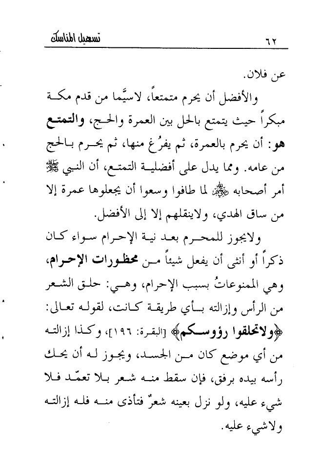 ولا يجوز للمحرم بعد نية الإحرام سواء كان ذكراً أو أنثى أن يفعل شيئاً من محظورات الإحرام، وهي الممنوعات بسبب الإحرام، وهي: حلق الشعر من الرأس وإزالته بأي طريقة كانت، لقوله تعالى: {ولاَ تحلقوا رؤوسكم} [البقرة: 196] ، وكذا إزالته من أي موضع كان من الجسد، ويجوز له أن يحك رأسه بيده برفق، فإن سقط منه شعر بلا تعمّد فلا شيء عليه، ولو نزل بعينه شعر فتأذى منه فله إزالته ولا شيء عليه.