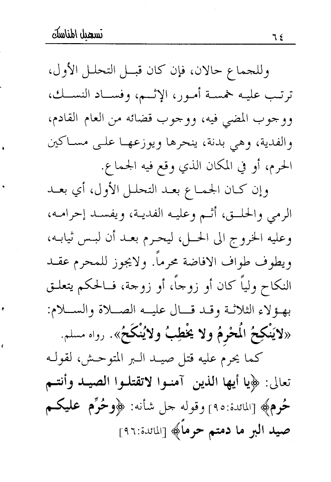 وإن كان الجماع بعد التحلل الأول، أي بعد الرمي والحلق، أثم وعليه الفدية، ويفسد إحرامه، وعليه الخروج إلى الحل، ليحرم بعد أن لبس ثيابه، ويطوف طواف الإفاضة محرماً. ولا يجوز للمحرم عقد النكاح ولياً كان أو زوجاً، أو زوجة، فالحكم يتعلق بهؤلاء الثلاثة وقد قال عليه الصلاة والسلام: "لا يَنْكِحُ المُحْرِمُ ولا يخْطِبُ ولا يُنْكَحُ" رواه مسلم.