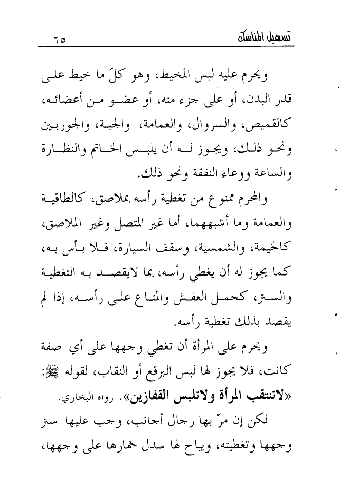 ويحرم عليه لبس المخيط، وهو كلّ ما خيط على قدر البدن، أو على جزء منه، أو عضو من أعضائه، كالقميص، والسروال، والعمامة، والجبة، والجور بين ونحو ذلك، ويجوز له أن يلبس الخاتم والنظارة والساعة ووعاء النفقة ونحو ذلك.