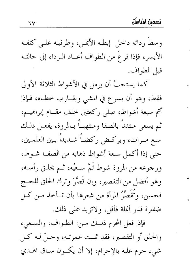 كما يستحبُ أن يرمل في الأشواط الثلاثة الأولى فقط، وهو أن يسرع في المشي ويقارب خطاه، فإذا أتم سبعة أشواط، صلى ركعتين خلف مقام إبراهيم، ثم يسعى مبتدئاً بالصفا ومنتهياً بالمروة، يفعل ذلك سبع مرات، ويركض ركضاً شديداً بين العلمين، حتى إذا أكمل سبعة أشراط ذهابه من الصفا شوط، ورجوعه من المروة شوط تَمَّ سَعيهُ، ثم يحلق رأسه، وهو أفضل من التقصير، وإن قصر وترك الحلق للحج فحسن، وتُقَصِّرُ المرأة من شعرها بأن تأخذ من كل ضفيرة قدر أنملة فأقل، ولا تزيد على ذلك.