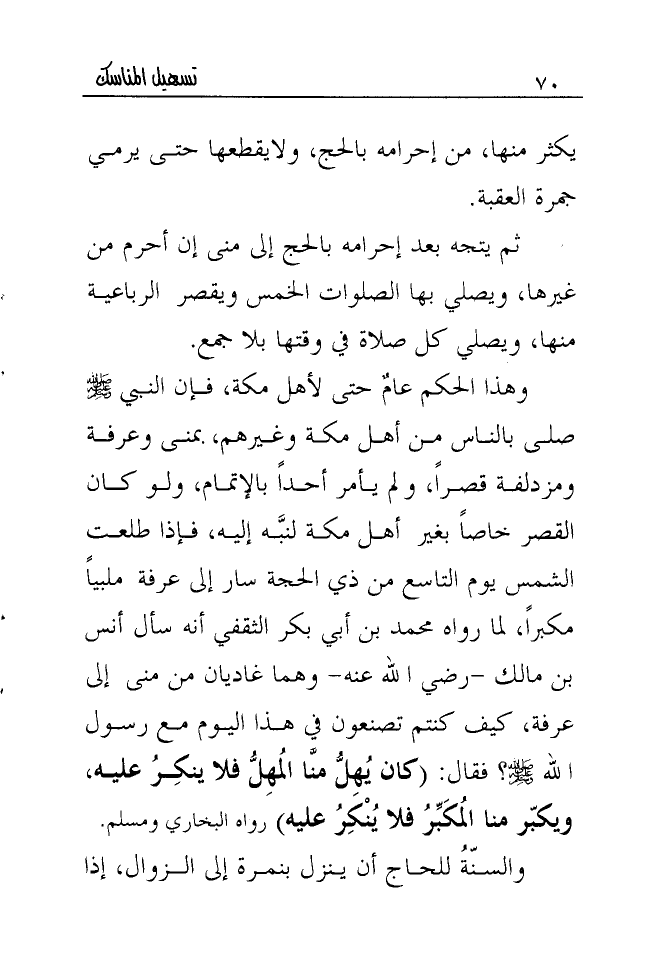 وهذا الحكم عام حتى لأهل مكة، فإن النبي صلى الله عليه وسلم صلى بالناس من أهل مكة وغيرهم، بمنى وعرفة ومزدلفة قصراً، ولم يأمر أحداً بالإتمام، ولو كان القصر خاصاً بغير أهل مكة لنبه إليه، فإذا طلعت الشمس يوم التاسع من ذي الحجة سار إلى عرفة ملبياً مكبراً، لما رواه محمد بن أبى بكر الثقفى أنه سأل أنس بن مالك- رضي الله عنه- وهما غاديان من منى إلى عرفة، كيف كنتم تصنعون في هذا اليوم مع رسول الله صلى الله عليه وسلم؟ فقال: "كان يُهِلُّ منَّا المُهِلُّ فلا ينكِرُ عليه، ويكبّر منا المُكَبِّرُ فلا يُنْكِرُ عليه " رواه البخاري ومسلم.