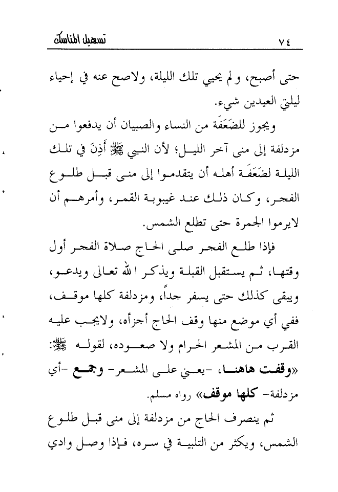 فإذا طلع الفجر صلى الحاج صلاة الفجر أول وقتها، ثم يستقبل القبلة ويذكر الله تعالى ويدعو، ويبقى كذلك حتى يسفر جداً، ومزدلفة كلها موقف، ففي أي موضع منها وقف الحاج أجزأه، ولا يجب عليه القرب من المشعر الحرام ولا صعوده، لقوله صلى الله عليه وسلم: "وقفت هاهنا"- يعني على المشعر - وجمع- أي مزدلفة - كلها موقف "رواه مسلم.