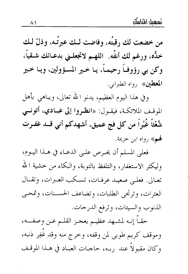 حقاً إنه لمشهد عظيم يعجز القلم عن وصفه، وموقف كريم طوبى لمن وقفه، وخرج منه وقد غُفِر ذنبه، وكان مقبولاً عند ربه، حاجات العباد في هذا الموقف