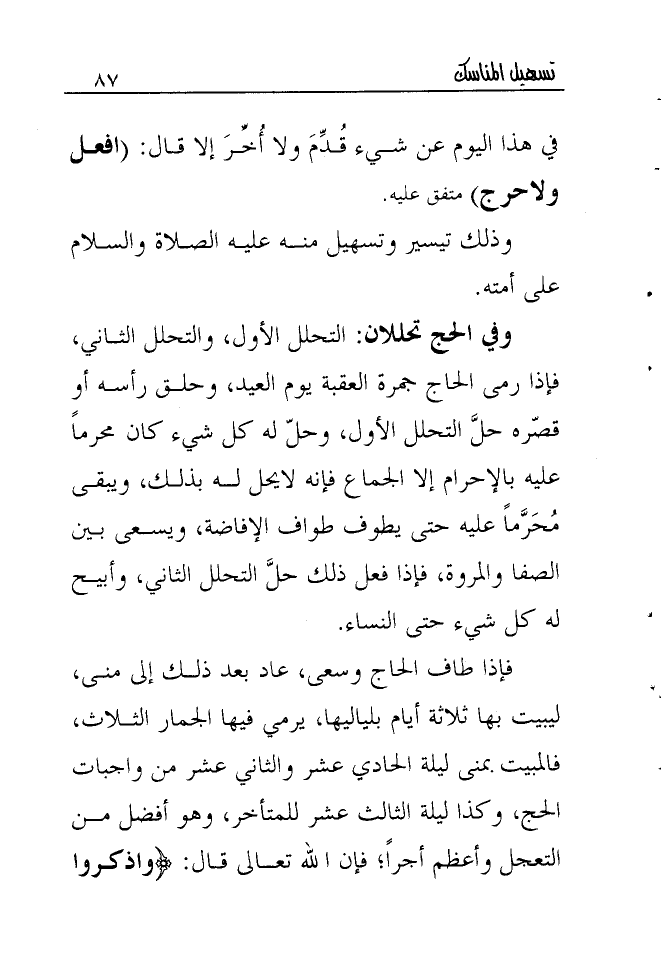 في هذا اليوم عن شيء قدم ولا أُخِّرَ إلا قال: " افعل ولا حرج" متفق عليه.