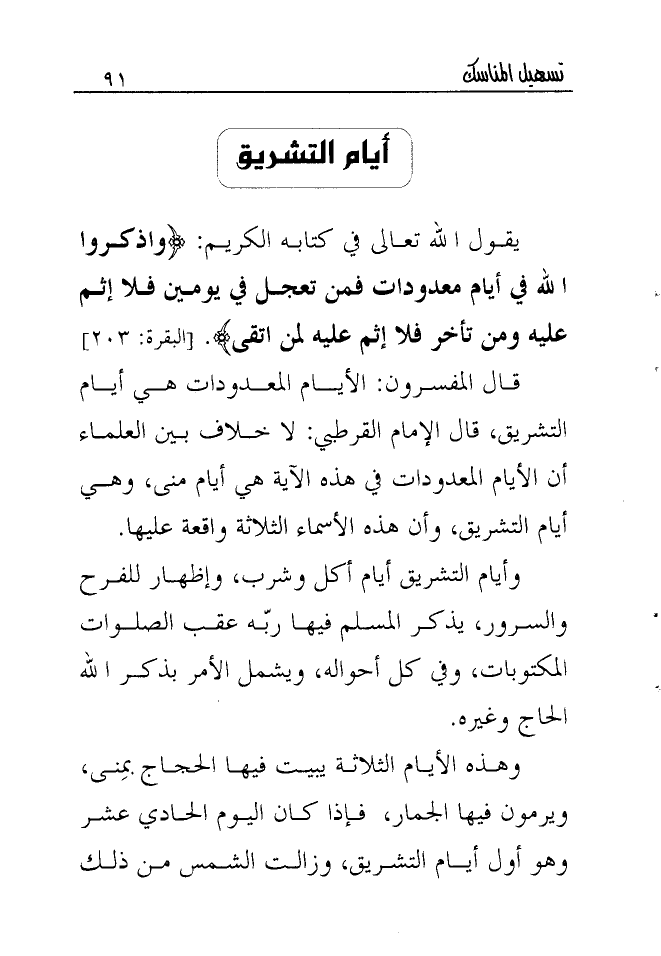 يقول الله تعالى في كتابه الكريم: {وَاذْكُرُوا اللَّهَ فِي أَيَّامٍ مَعْدُودَاتٍ فَمَنْ تَعَجَّلَ فِي يَوْمَيْنِ فَلا إِثْمَ عَلَيْهِ وَمَنْ تَأَخَّرَ فَلا إِثْمَ عَلَيْهِ لِمَنِ اتَّقَى} [البقرة: 203] .