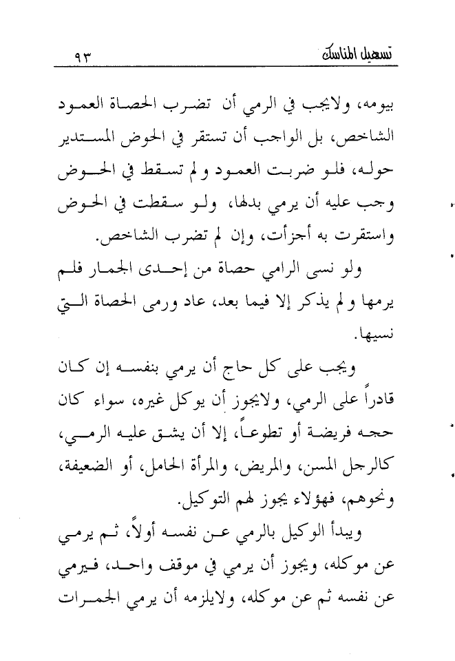 بيومه، ولا يجب في الرمي أن تضرب الحصاة العمود الشاخص، بل الواجب أن تستقر في الحوض المستدير حوله، فلو ضربت العمود ولم تسقط في الحوض وجب عليه أن يرمي بدلها، ولو سقطت في الحوض واستقرت له أجزأت، وإن لم تضرب الشاخص.