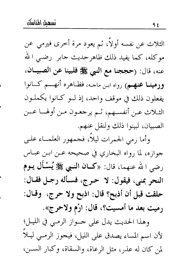 وأما رمي الجمرات ليلاً، فجمهور العلماء على جوازه، لما رواه البخاري في صحيحه عن ابن عباس رضي الله عنهما، قال: " كان النبي صلى الله عليه وسلم يُسْأَل يوم النحر بمنى، فيقول: لا حرج، فسأله رجل فقال: حلقت قبل أن أذبح؟ قال: اذبح ولا حرج، وقال: رميت بعد ما أمسيت؟، قال: ارم ولا حرج ".