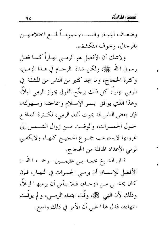 ولاشك أن الأفضل هو الرمي نهاراً كما فعل رسول الله صلى الله عليه وسلم، ولكن شدة الزحام في هذا الزمن، وكثرة الحجاج، وما يجد كثير من الناس من المشقة في الرمي نهاراً، كل ذلك يرجح القول بجواز الرمي ليلا، وهذا الذي يوافق يسر الإسلام وسماحته وسهولته، فإن بعض الناس قد يموت أثناء الرمي، لكثرة التدافع حول الجمرات، والوقت من زوال الشمس إلى غروبها لا يستوعب جموع الحجيج كلها، ولا يكفى لرمي الأعداد الهائلة من الحجاج.