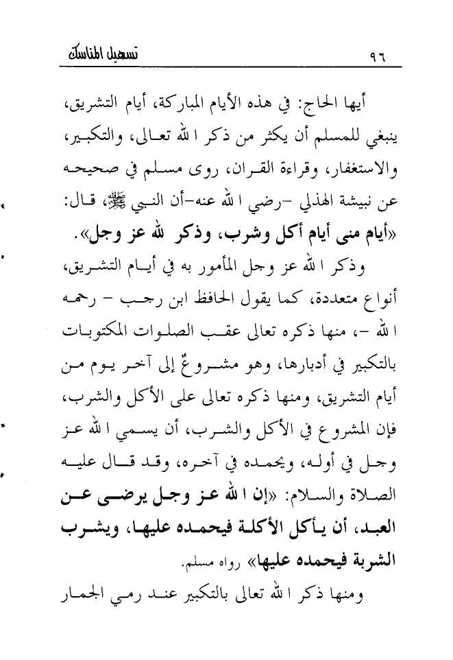 أيها الحاج: في هذه الأيام المباركة، أيام التشريق، ينبغي للمسلم أن يكثر من ذكر الله تعالى، والتكبير، والاستغفار، وقراءة القران، روى مسلم في صحيحه عن نبيشة الهذلي- رضي الله عنه- أن النبي صلى الله عليه وسلم، قال: "أيام منى أيام أكل وشرب وذكر لله عز وجل".