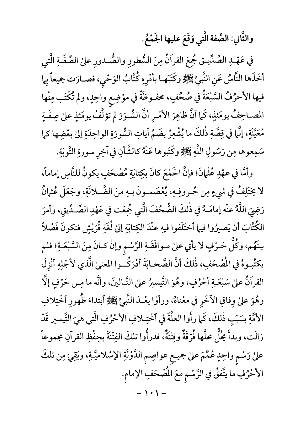 الضّلالة، وجعل عثمان رضي الله عنه إمامه في ذلك الصّحف الّتي جمعت في عهد الصّدّيق، وأمر الكتّاب أن يصيروا فيما اختلفوا فيه عند الكتابة إلى لغة قريش فتكون فصلا بينهم، وكلّ حرف لا يأتي على موافقة الرّسم وإن كان من السّبعة؛ فلم يكتبوه في المصحف، ذلك أنّ الصّحابة أدركوا المعنى الّذي لأجله أنزل القرآن على سبعة أحرف، وهو التّيسير على التّالين، وأنّه ما من حرف إلّا وهو على وفاق الآخر في معناه، ورأوا بعد النّبيّ صلى الله عليه وسلم ابتداء ظهور اختلاف الأمّة بسبب ذلك، كما رأوا العلّة في اختلاف الأحرف الّتي هي التّيسير قد زالت، وبدأ يحلّ محلّها فرقة وفتنة، فدرءوا تلك الفتنة بحفظ القرآن مجموعا على رسم واحد عمّم على جميع عواصم الدّولة الإسلاميّة، وبقي من تلك الأحرف ما يتّفق في الرّسم مع المصحف الإمام.
