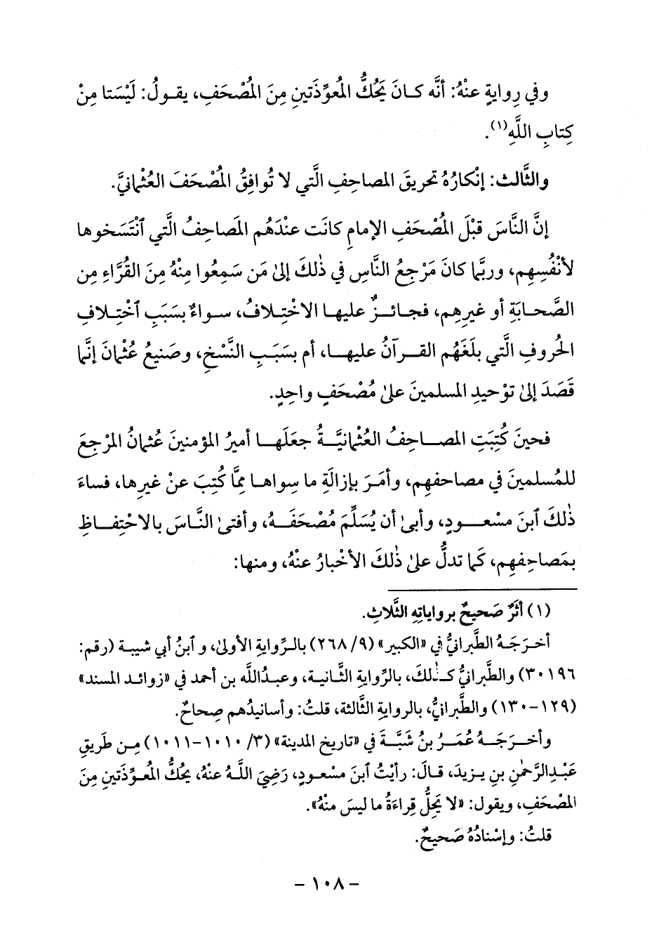 فحين كتبت المصاحف العثمانيّة جعلها أمير المؤمنين عثمان المرجع للمسلمين في مصاحفهم، وأمر بإزالة ما سواها ممّا كتب عن غيرها، فساء ذلك ابن مسعود، وأبى أن يسلّم مصحفه، وأفتى النّاس بالاحتفاظ بمصاحفهم، كما تدلّ على ذلك الأخبار عنه، ومنها: