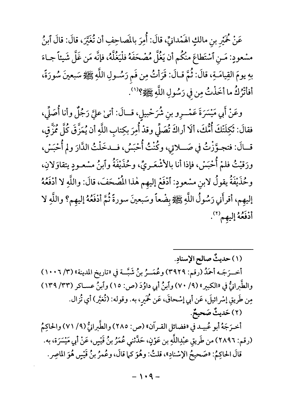 وعن أبي ميسرة عمرو بن شرحبيل، قال: أتى عليّ رجل وأنا أصلّي، فقال: ثكلتك أمّك، ألا أراك تصلّي وقد أمر بكتاب الله أن يمزّق كلّ ممزّق، قال: فتجوّزت في صلاتي، وكنت أحبس، فدخلت الدّار ولم أحبس، ورقيت فلم أحبس، فإذا أنا بالأشعريّ، وحذيفة وابن مسعود يتقاولان، وحذيفة يقول لابن مسعود: ادفع إليهم هذا المصحف، قال: والله لا أدفعه إليهم، أقرأني رسول الله صلى الله عليه وسلم بضعا وسبعين سورة ثمّ أدفعه إليهم؟ والله لا أدفعه إليهم (¬2).