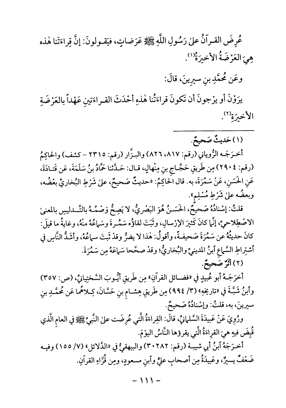 وعن محمّد بن سيرين، قال: يرون أو يرجون أن تكون قراءتنا هذه أحدث القراءتين عهدا بالعرضة الأخيرة (¬2).