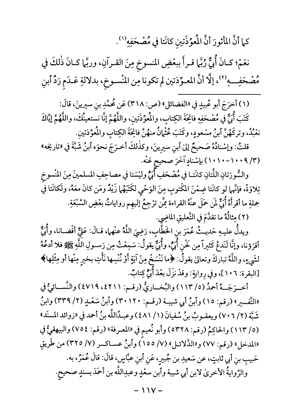 نعم؛ كان أبيّ ربّما قرأ ببعض المنسوخ من القرآن، وربّما كان ذلك في مصحفه (¬2)، إلّا أنّ المعوّذتين لم تكونا من المنسوخ، بدلالة