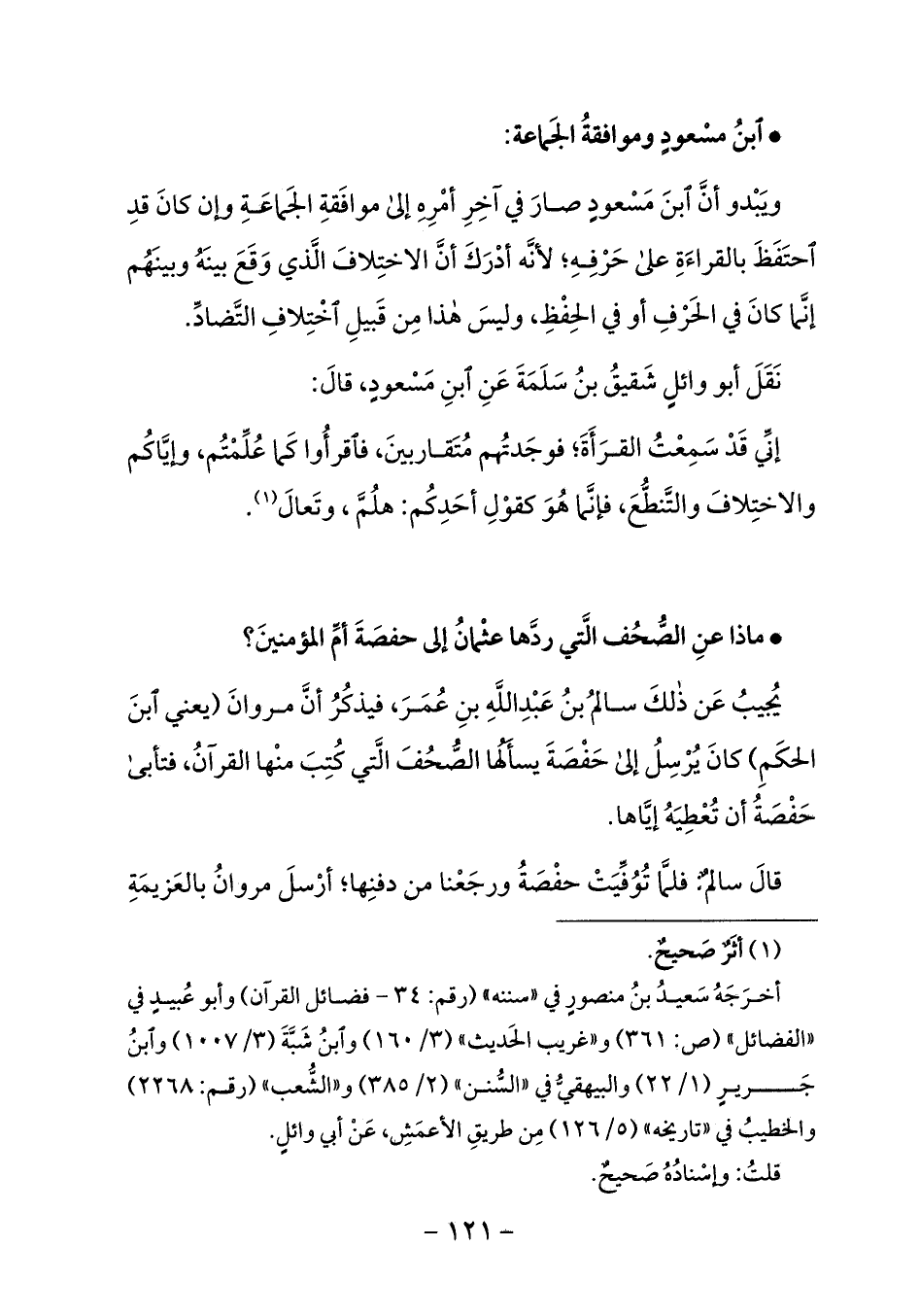 يجيب عن ذلك سالم بن عبد الله بن عمر، فيذكر أنّ مروان (يعني ابن الحكم) كان يرسل إلى حفصة يسألها الصّحف الّتي كتب منها القرآن، فتأبى حفصة أن تعطيه إيّاها.