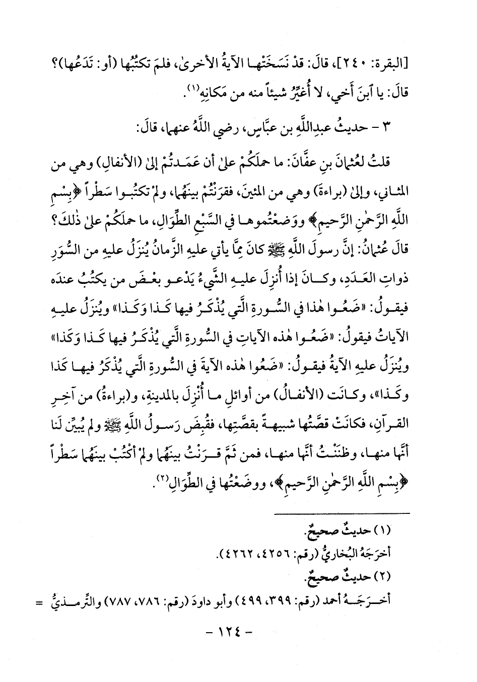 قلت لعثمان بن عفّان: ما حملكم على أن عمدتم إلى (الأنفال) وهي من المثاني، وإلى (براءة) وهي من المئين، فقرنتم بينهما، ولم تكتبوا سطرا بِسْمِ اللَّهِ الرَّحْمنِ الرَّحِيمِ 1 ووضعتموها في السّبع الطّوال، ما حملكم على ذلك؟ قال عثمان: إنّ رسول الله صلى الله عليه وسلم كان ممّا يأتي عليه الزّمان ينزل عليه من السّور ذوات العدد، وكان إذا أنزل عليه الشّيء يدعو بعض من يكتب عنده فيقول: «ضعوا هذا في السّورة الّتي يذكر فيها كذا وكذا» وينزل عليه الآيات فيقول: «ضعوا هذه الآيات في السّورة الّتي يذكر فيها كذا وكذا» وينزل عليه الآية فيقول: «ضعوا هذه الآية في السّورة الّتي يذكر فيها كذا وكذا»، وكانت (الأنفال) من أوائل ما أنزل بالمدينة، و (براءة) من آخر القرآن، فكانت قصّتها شبيهة بقصّتها، فقبض رسول الله صلى الله عليه وسلم ولم يبيّن لنا أنّها منها، وظننت أنّها منها، فمن ثمّ قرنت بينهما ولم أكتب بينهما سطرا بِسْمِ اللَّهِ الرَّحْمنِ الرَّحِيمِ 1، ووضعتها في الطّوال (¬2).