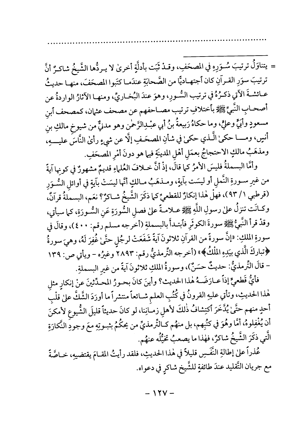 وأمّا البسملة فليس الأمر كما قال، إذ أنّ خلاف العلماء قديم مشهور في كونها آية من غير سورة النّمل أو ليست بآية، ومذهب مالك أنّها ليست بآية في أوائل السّور (قرطبي 1/ 93)، فهل هذا إنكار للقطعيّ كما ذكر الشّيخ شاكر؟ نعم، البسملة قرآن، وكانت تنزل على رسول الله صلى الله عليه وسلم علامة على فصل السّورة عن السّورة، كما سيأتي، وقد قرأ النّبيّ صلى الله عليه وسلم سورة الكوثر فابتدأ بالبسملة (أخرجه مسلم رقم: 400)، وقال في سورة الملك: «إنّ سورة من القرآن ثلاثون آية شفعت لرجل حتّى غفر له، وهي سورة تَبارَكَ الَّذِي بِيَدِهِ الْمُلْكُ» (أخرجه التّرمذيّ رقم: 2893 وغيره- ويأتي ص: 139 - قال التّرمذيّ: حديث حسن)، وسورة الملك ثلاثون آية من غير البسملة.