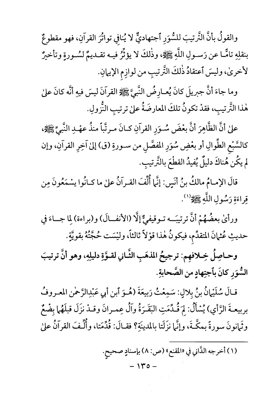 والقول بأنّ التّرتيب للسّور اجتهاديّ لا ينافي تواتر القرآن، فهو مقطوع بنقله تامّا عن رسول الله صلى الله عليه وسلم، وذلك لا يؤثّر فيه تقديم لسورة وتأخير لأخرى، وليس اعتقاد ذلك التّرتيب من لوازم الإيمان.
