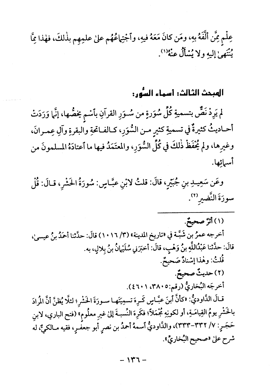 قال الدّاوديّ: «كأنّ ابن عبّاس كره تسميتها سورة الحشر؛ لئلّا يظنّ أنّ المراد بالحشر يوم القيامة، أو لكونه مجملا؛ فكره النّسبة إلى غير معلوم» (فتح الباري، لابن حجر: 7/ 332 - 333)، والدّاوديّ اسمه أحمد بن نصر أبو جعفر، فقيه مالكيّ، له شرح على «صحيح البخاريّ».