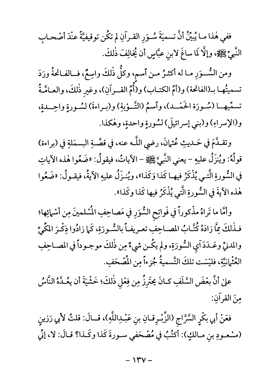 ذكر المكّيّ والمدنيّ وعدد آي السّورة، ولم يكن شيء من ذلك موجودا في المصاحف العثمانيّة، فليست تلك التّسمية جزءا من المصحف.