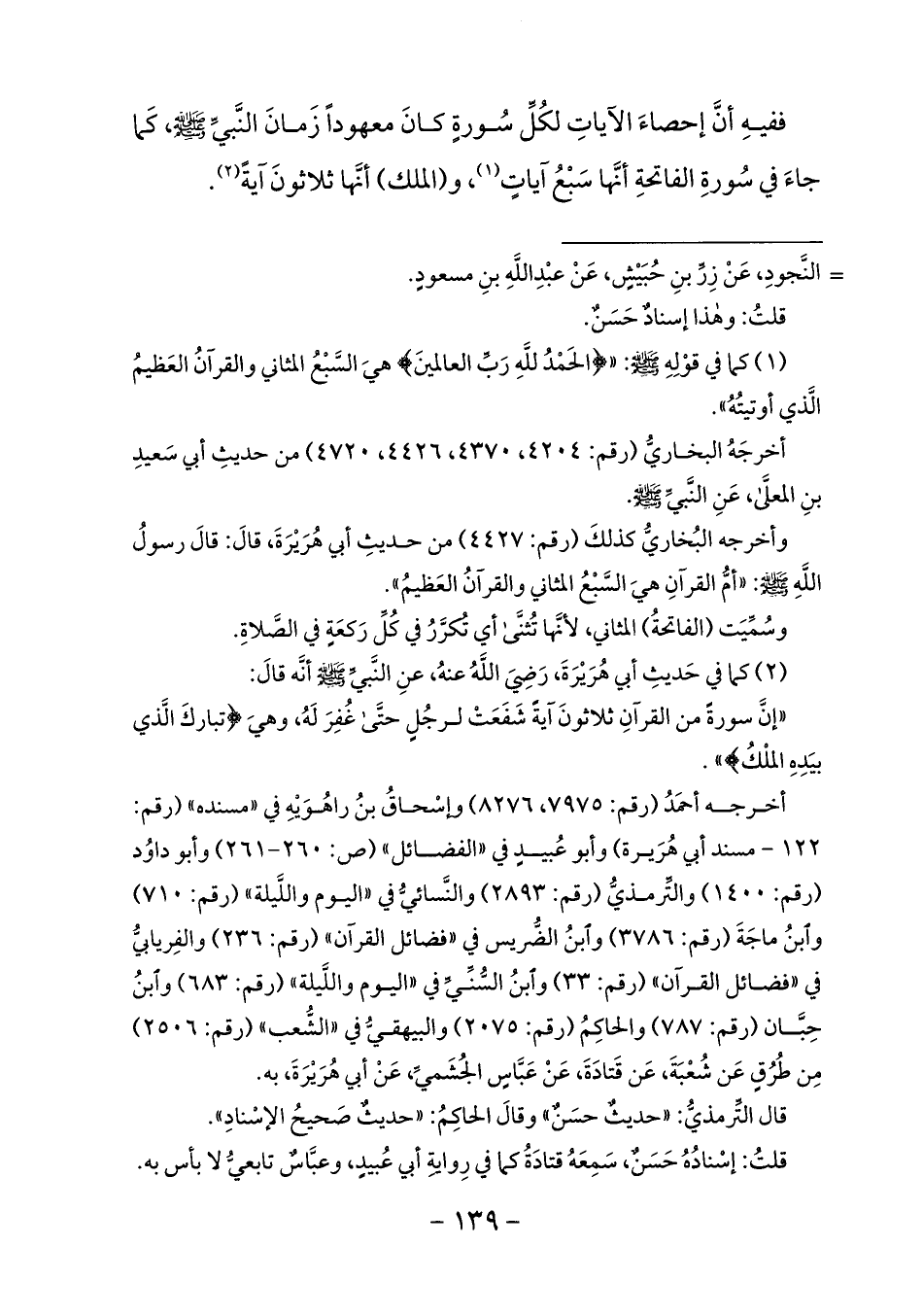ففيه أنّ إحصاء الآيات لكلّ سورة كان معهودا زمان النّبيّ صلى الله عليه وسلم، كما جاء في سورة الفاتحة أنّها سبع آيات (¬1)، و (الملك) أنّها ثلاثون آية (¬2).