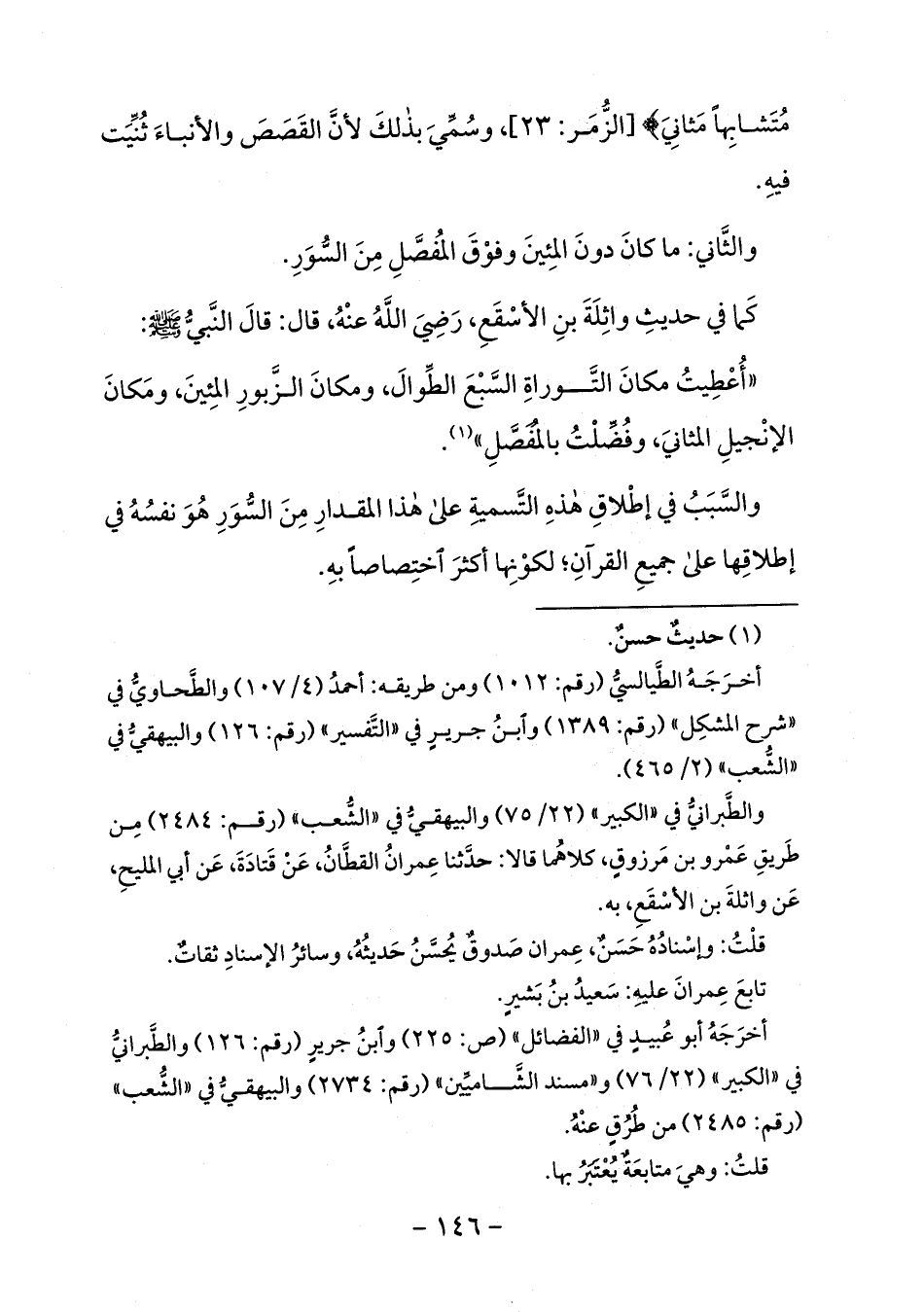 «أعطيت مكان التّوراة السّبع الطّوال، ومكان الزّبور المئين، ومكان الإنجيل المثاني، وفضّلت بالمفصّل» (¬1).